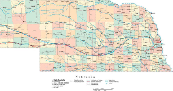 Nebraska Digital Vector Map with Counties, Major Cities, Roads